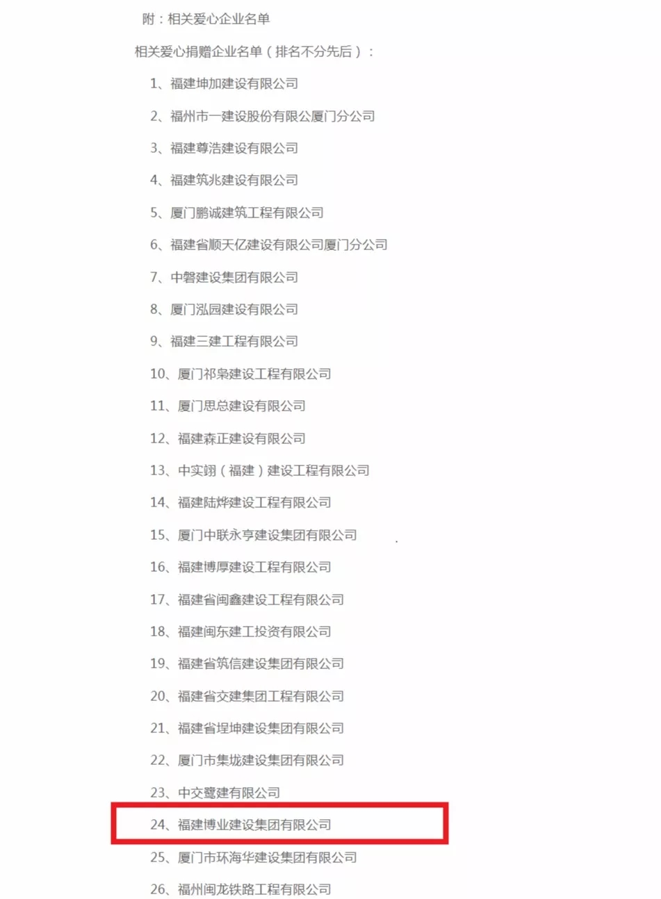 近日,我司通過(guò)廈門市建筑行業(yè)協(xié)會(huì)對(duì)接武漢市建筑業(yè)協(xié)會(huì)、廈門市紅十字會(huì)、廈門市圓夢(mèng)扶貧基金會(huì)等單位進(jìn)行捐資,用于廈門、湖北武漢的新型冠狀病毒感染肺炎疫情防控專項(xiàng)使用。在此,向所有奮戰(zhàn)在疫情一線的醫(yī)務(wù)人員及所有堅(jiān)守崗位共抗疫情的各界人士致敬!